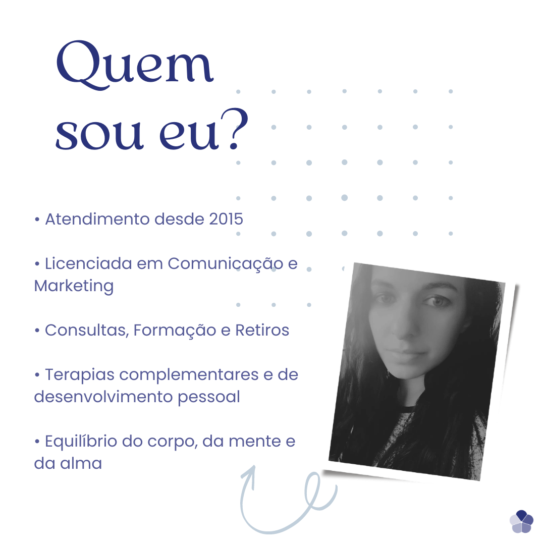 Terapias complementares e de desenvolvimento pessoal, às quais se dedica desde 2015. Desenvolve o seu trabalho em sessões individuais, em grupo, experiências vivênciais (retiros) e formação. Além da formação superior em Comunicação e Marketing, o seu percurso engloba formação e experiência em várias áreas do mundo terapêutico, tais como Kinesiologia, Constelações, Meditação, Reiki, Astrologia, Tarot, entre outras.